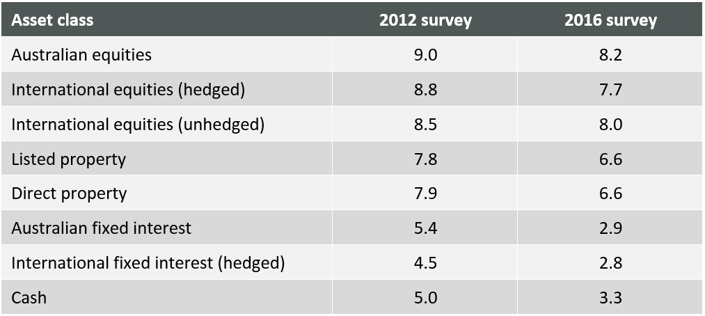 Source: Rice Warner 2016 survey of asset consultants’/fund managers expected annual returns over 10 years.