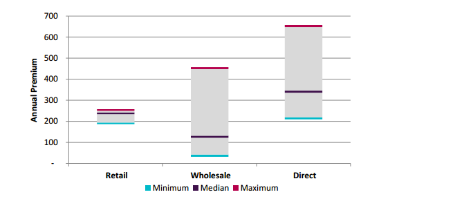 In response to the declining profitability and product changes, prices for the Death, Death and TPD and Income Protection product segments have spiked over the past year by 15 per cent, 26 per cert and 19 per cent respectively, on average, across the market. As a result the price differences for between wholesale, retail and direct products have narrowed. The graph attached shows an example for death cover only of $200,000 for a male aged 40.