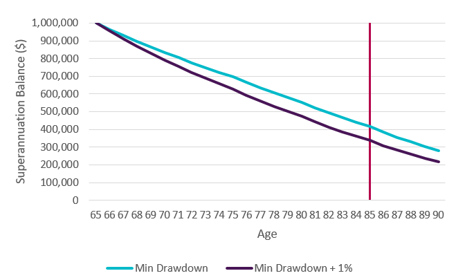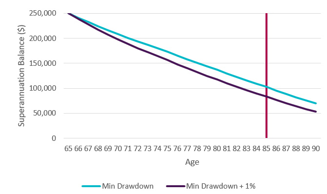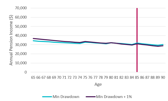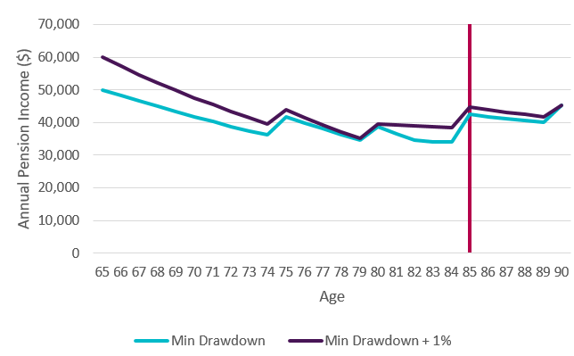 With a 1% increase in minimum drawdown rates, both scenarios have shown an increase in the net present value of total retirement income to life expectancy, without exhausting retirees assets.