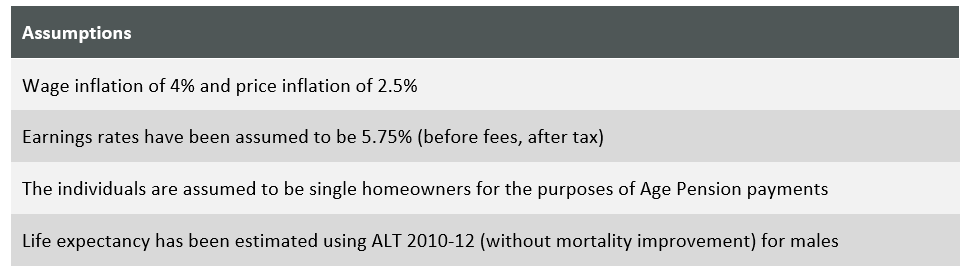 For the individual retiring with $250,000 in assets, there is an increase in annual pension income over their first 15 years of retirement. Pension income decreases long term as the member moves onto the full Age Pension and has fewer remaining assets. Despite the increased income earlier in their retirement, this individual still holds $84,000 in assets at life expectancy (85 years for a 65-year-old male today). Whilst their income later in life is marginally lower, the increased income earlier in their retirement increases the net present value of the total amount of income to life expectancy from $675,000 to $693,000 (2.7%).