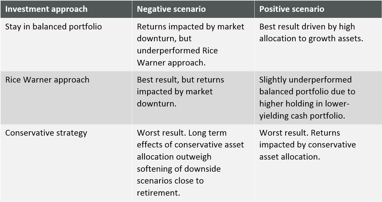 Rice Warner’s approach, a growth-orientated portfolio with a cash account, produced the best results in a negative investment scenario yet did not materially affect outcomes in positive investment scenarios.