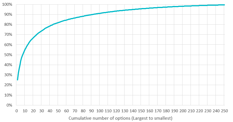 Graph 2 demonstrates that this concentration of investments across a small number of options is true even in the retail fund sector (where Choice and financial advice are more prevalent). In this scenario, 30 of the options on offer across all funds account for 75% of all investments.