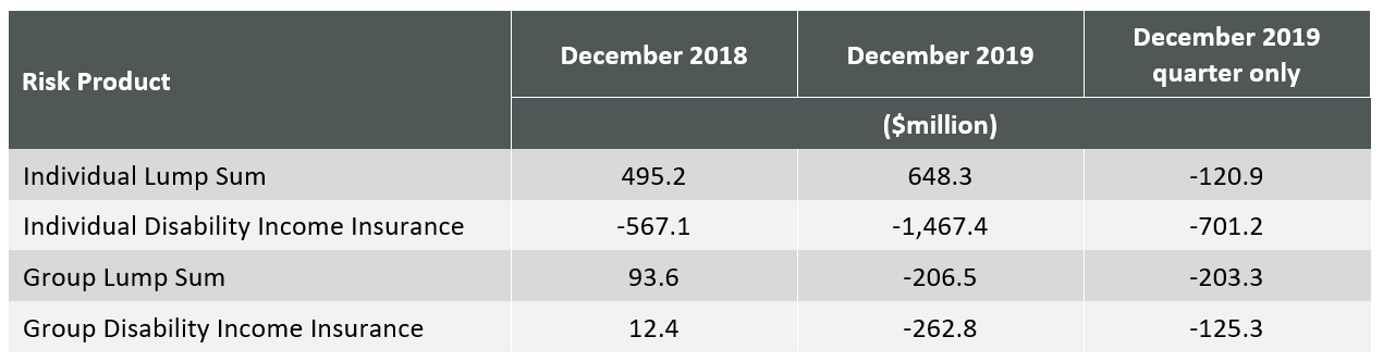 For the 12 months to December 2019, risk products reported a combined after-tax loss of $1.3 billion. All risk products deteriorated with the only exception being the Individual Lump Sum product. In particular, Individual Disability Income Insurance (also known as Income Protection Insurance) reported a substantial loss, primarily driven by the persistence of adverse claims experience.