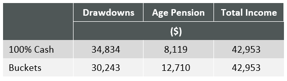 Effectively, the Age Pension becomes a put option on any downturn in market prices.  It also means the member’s Cash bucket lasts longer, allowing a higher chance of recovery without eating into capital.