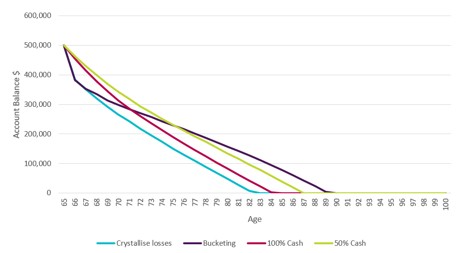Take for example the following retiring member aged 65 with a $500,000 retirement benefit.  They invest an initial balance of $500,000 but immediately experience a market crash.  At retirement, the member allocates a year’s cash drawdowns (at the ASFA Comfortable standard) to cash with 50% in a balanced portfolio to cover the following 10 years, and 50% in high growth for the period thereafter.
