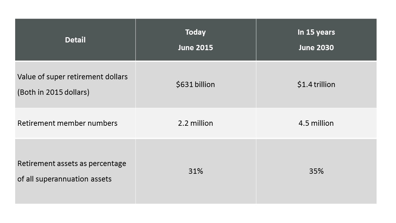 We expect the number of retirement members in all superannuation fund sectors to more than double to 4.5 million over this period and the value of superannuation retirement assets to rise from $631 billion (as at June 2015) to $1.4 trillion (in 2015 dollars).This year alone, 250,000 new retirees will join the retirement ranks with some $35 billion in benefits.
