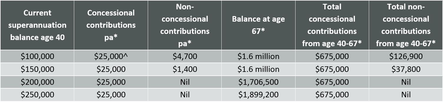 - Each fund member will mainly rely on the combination of concessional contributions (in some cases markedly below the proposed annual cap on these contributions) and the investment earnings of their funds, utilising the benefits of compounding returns over 27 years.