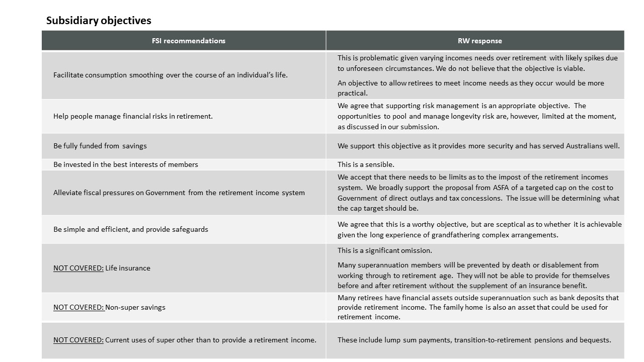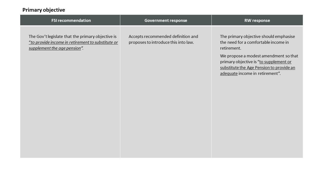We suggest that the primary objective is extended to cover “adequacy” of retirement income and point to the significant omissions in the subsidiary objectives of the roles of life insurance and non-superannuation savings.