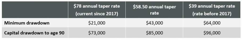 As Table 2 shows, if the retiree draws down the minimum amount each year, the annual taper rate would need to be close to $39 for the retiree to receive total payments higher than the accumulated reduction in the person’s net take home pay of $61,000. The retiree would be in fact be better off under a $78 annual taper rate if he/she also gradually draw down all their capital by age 90. In this scenario, the retiree’s overall net benefit would further improve with the lower taper rates.